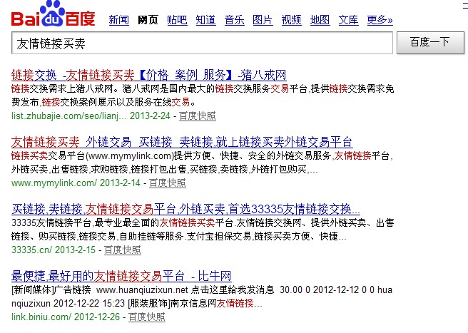可能有人會問了,百度為什么不用算法直接K掉這些站呢?這是因為一個知名的網站,比如阿里微微,外鏈過萬,alexa排名一萬名以內,知名度高,如果以算法來進行處罰,會影響到很多優質的網站,所以只有進行人工干預,我這么說不是沒有道理的,大家看下面這張圖,我在百度搜索“友情鏈接買賣”,大家可以看到,目前排在首頁的都是以前一些影響較小的鏈接交易站,但在這次的算法更新中并沒有被K,就說明了百度確實施行了人工干預。